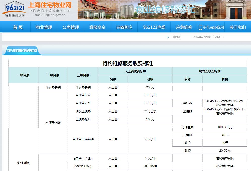 据介绍,962121热线特约维修服务上线后,各家特约维修服务单位做到各项服务“统一标准,统一收费”。市物业中心在上海住宅物业网公示了最新的特约维修服务七大类67项服务内容的服务价格,包括特约维修服务中的上门费、维修费和材料费等收费标准,进一步推动维修服务收费公开、透明。