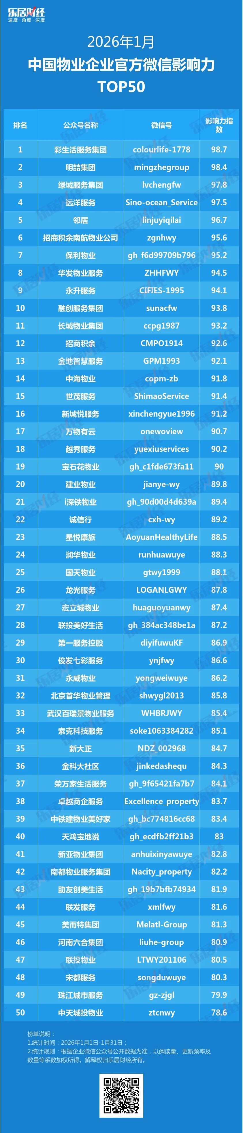 本期榜单,乐居财经共收集149家在1月份有更新的物企微信号作为样本,根据库内账号的多项公开数据,包括文章推送频次、总发文数量、总阅读量,以及单篇文章的爆文指数等系数加权得出影响力指数。
